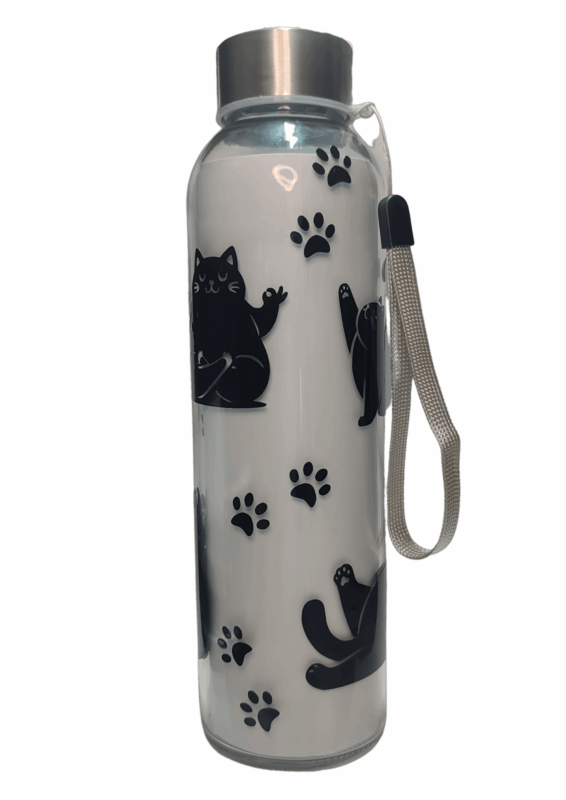 Elige esta botella de cristal con diseño de gatos haciendo yoga para tener una botella elegante, saludable y respetuosa con el medio ambiente. Nuestra botella de cristal 100% libre de BPA con tapón de acero inoxidable a rosca es la opción perfecta para quienes valoran el diseño atemporal.