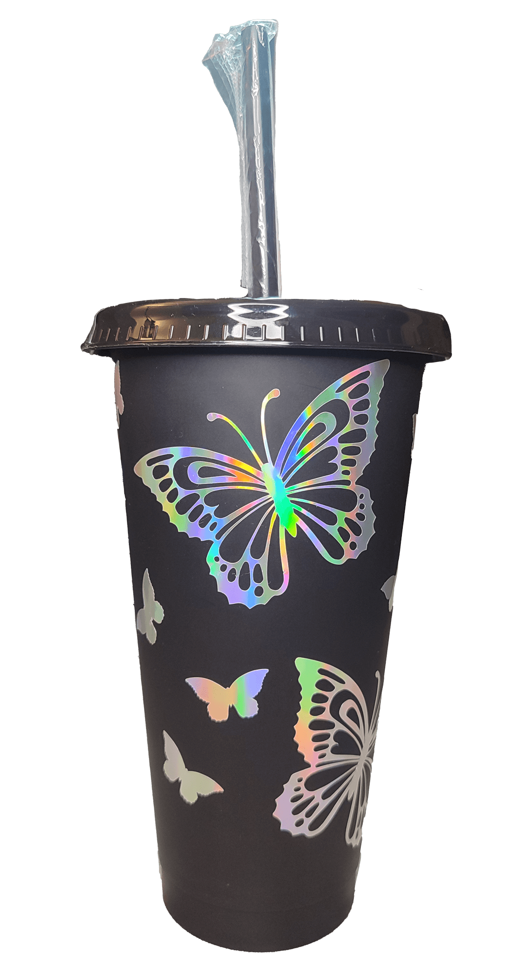 ¡Un vaso mágico que transforma cada sorbo en una experiencia instagrameable! Este vaso de plástico PP resistente en tono negro mate luce un deslumbrante diseño de mariposas holográficas que cambian de color con la luz. Incluye tapa hermética anti-fugas y pajita reutilizable, ideal para llevar tu bebida favorita con estilo.